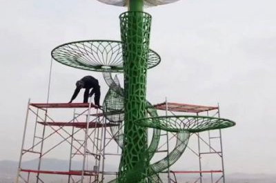 景區(qū)花籃雕塑是入口集散廣場。這里種植了許多樹木,代表原始森林,寓意人類社會伊始,原始森林茂密繁盛。景區(qū)花籃雕塑是過渡廣場。在這個過渡空間里,森林已經(jīng)遭到破壞。寓意人類破壞自然,樹木逐漸變少。景區(qū)花籃雕塑是豎向裝置體驗廣場。